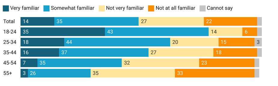 Not surprisingly, there’s a big difference across age groups, with younger Canadians being much more likely to say they’re familiar with AI programs that people can use in the workplace.