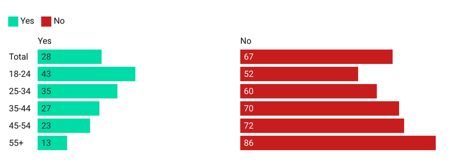 The proportion that uses such programs is lower than the proportion expressing some familiarity with them: 28 percent of employed Canadians say they’ve used an artificial intelligence program to help with tasks at work. But once again, that proportion is much higher among younger workers.